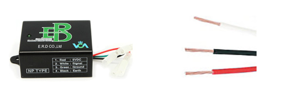 ④ 자동차 키를 OFF 한 뒤, 순서①의 ERD보조선과 5V,S선,G선으로 구분된 3항 차량 배선의 벗겨 낸 부위를 각각 T자 형태로 확실하게 연결하고, 절연 전기 테이프로 완벽하게 감아준 후, 이알디 제품 본체의 배선 캡과 보조선의 캡을 연결하면 설치가 완료됩니다
