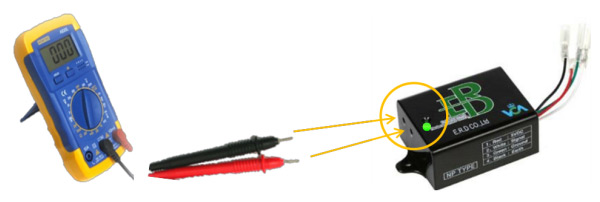 ⑤ 차량의 시동을 켜고 이알디 본체의 녹색램프가 켜지면 정상 설치된 것이며, 테스터기의 봉을 이알디 제품 측면의 (+),(-)포인트에 꽃고, 엑셀레이터를 밟을 때 테스터기의 전압값이 커졌다 작아졌다 하면서 변하면 정상 작동하는 것입니다.