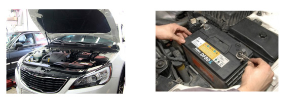 ⑦ ECU 초기화를 위해 본넷을 열고 배터리 마이너스(-)단자를 해체하고 5~10분 후 재조립합니다.